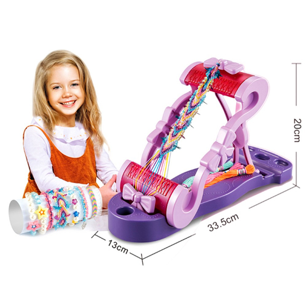Комплектът съдържа стан, цветни мъниста в различна форма и конци, на които се наплитат гривничките.